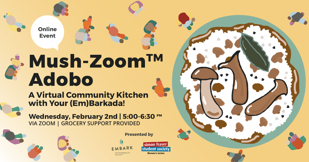 This February, Community Kitchen returns to Zoom with some extra oomph! Join Embark Sustainability and the SFSS Women’s Centre for a guided discussion about Filipino food, accessing cultural foods in Metro Vancouver, and our relationships to the meals we cook, share, and enjoy. Together we’ll become a barkada of our very own!